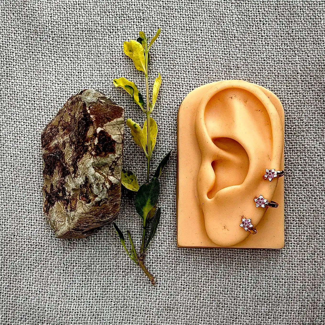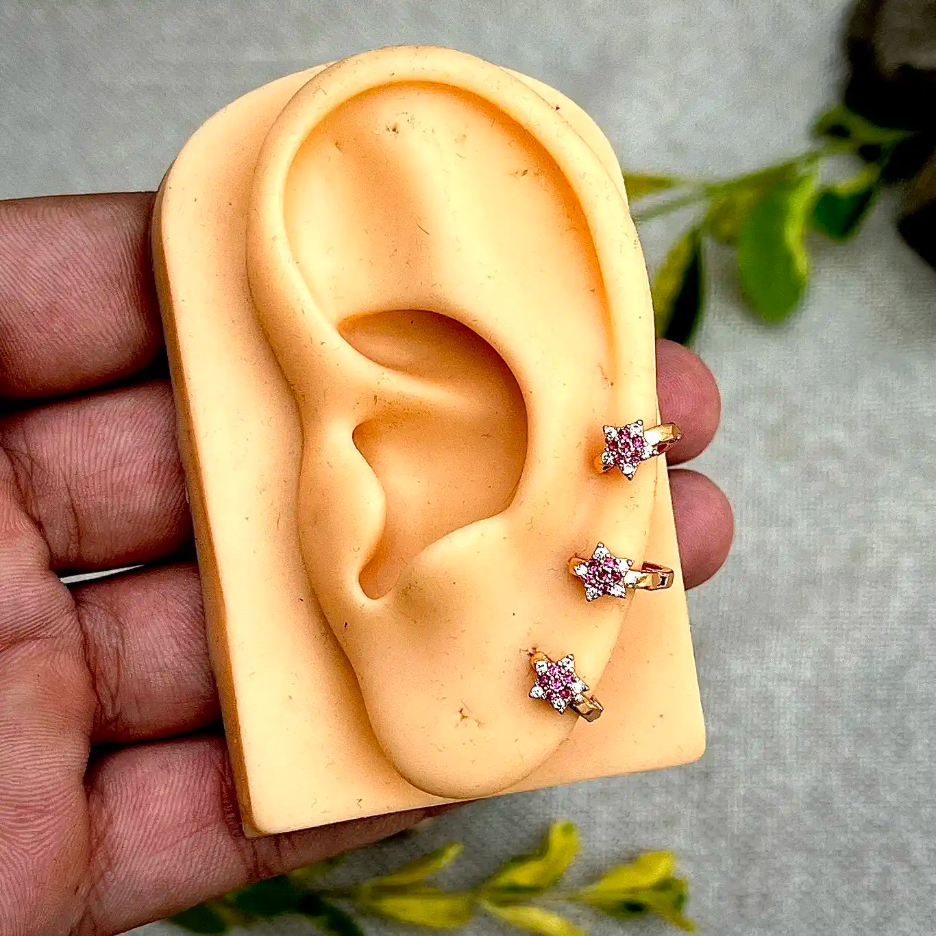 Add a cute sparkle to your style with our 7mm tiny ruby pink star hoop earrings, designed for upper piercing, helix, cartilage, and tragus. Featuring a delicate star design on a gold plated hoop, these earrings are lightweight, stylish, and perfect for daily wear.